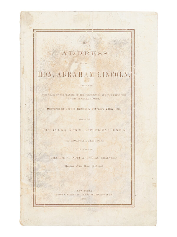 LINCOLN, Abraham (1809-1865). The Address of the Hon. Abraham Lincoln, in vindication of the policy of the framers of the Constitution and the Principles of the Republican Party, Delivered at Cooper Institute, February 27, 1860. New York: George F. Nesbitt & Co., 1860.