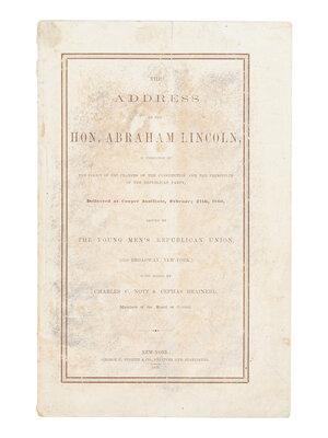 FIRST EDITION, FIRST ISSUE OF LINCOLN'S FAMED COOPER UNION SPEECH, with p. 32 unnumbered (in 1907, a reprint that was almost indistinguishable from the original was reissued with an explanation laid in and p. 32 numbered).