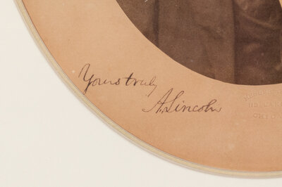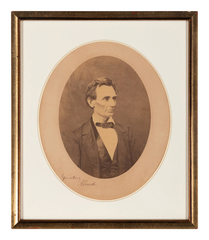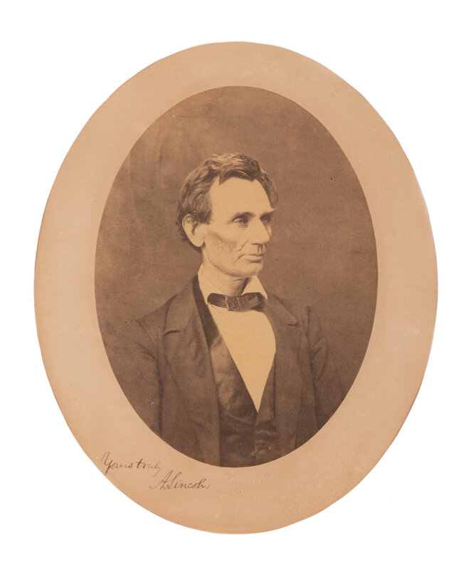 Albumen print on larger cardstock mount; 8 x 6 in. (203 x 152 mm). Inscribed in ink at lower left mount: "Yours truly / A. Lincoln". Hesler's rare blindstamp at center mount below image ("113 Lake St., Chicago"). Minor spotting to image and mount; unexamined out of the frame, 14 1/2 x 12 in. (368 x 305 mm).