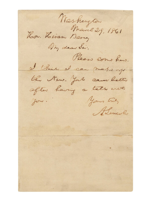 Reads in full: "My dear Sir; Please come here. I think I can make up the New York card better after having a talk with you. Yours truly A. Lincoln."