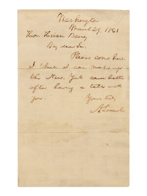 LINCOLN, Abraham (1809-1868). Autograph letter signed ("A. Lincoln") to Hiram Barney. Washington, D.C., 29 March 1861.