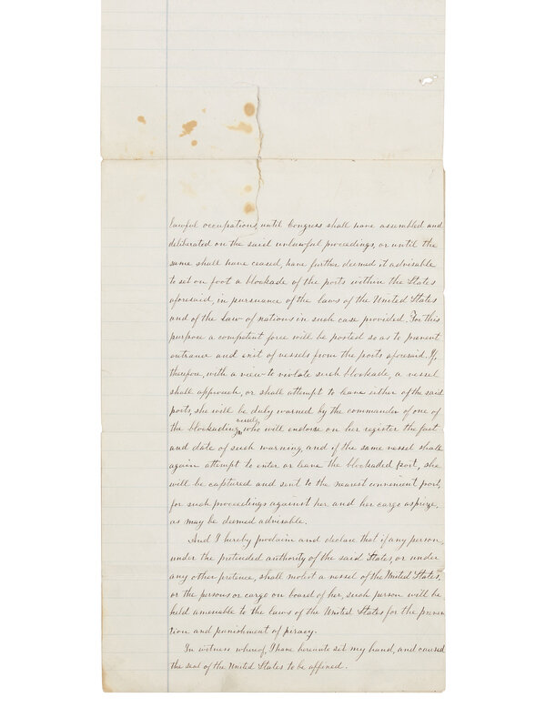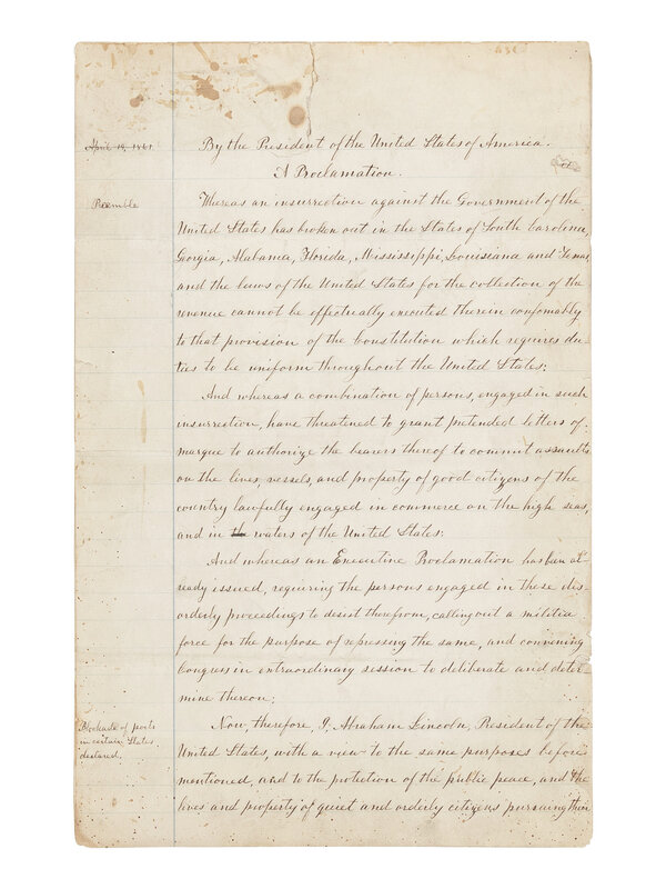 A VERY RARE PUBLISHER'S CORRECTED MANUSCRIPT OF PRESIDENT LINCOLN'S IMPORTANT PROCLAMATION issuing a general blockade of ports in the seven Southern States that had seceded from the Union (South Carolina, Georgia, Alabama, Florida, Mississippi, Louisiana, and Texas).