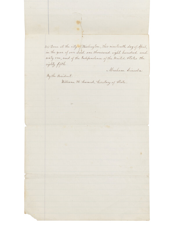 The final text of the proclamation was printed by the Government Printing Office on April 19, 1861, in both broadside and bifolium format, and reflect the manuscript emendations in this document.