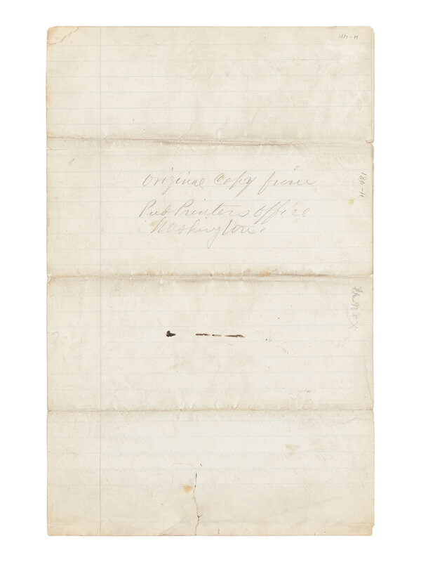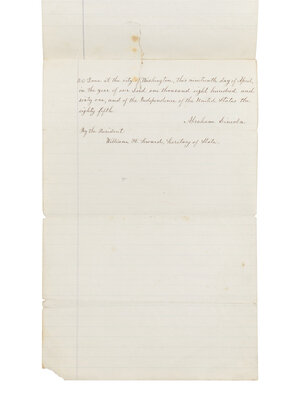 3 pp., on rectos only; 12 1/2 x 8 in. (317 x 203 mm). Manuscript emendations and corrections in ink; secretarially signed on behalf of President Lincoln and Secretary of State William Seward. Integral leaf with note in later hand, "original copy from Pub Printers Office Washington." Sheets affixed at top edge, first leaf starting; creasing from old folds; scattered soiling; closed tear at top of each page; extremities lightly worn.