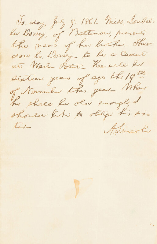 Reads in full: "To-Day July 9. 1861. Miss Isabella Dorsey, of Baltimore, presents the name of her brother—Theodore C. Dorsey—to be a Cadet at West-Point—He will be sixteen years of age the 19th of November this year—When he shall be old enough I should like to oblige his sister—A. Lincoln".