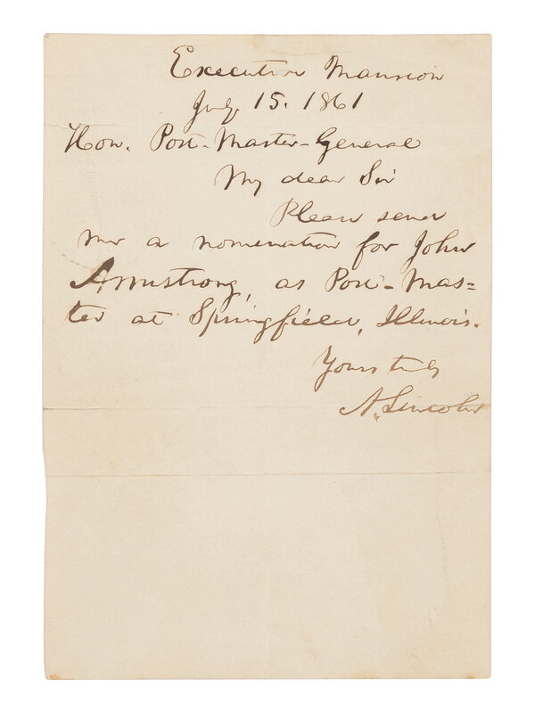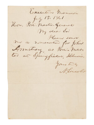 In full: "Executive Mansion July 15. 1861 Hon. Post-Master-General My dear Sir Please send me a nomination for John Armstrong, as Post-Master at Springfield, Illinois. Yours truly A. Lincoln".