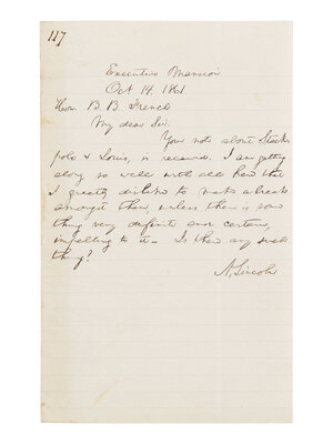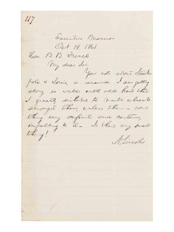 LINCOLN, Abraham (1809-1865). Autograph letter signed ("A. Lincoln") to Benjamin Brown French. Executive Mansion, [Washington, D.C.], 14 October 1861.