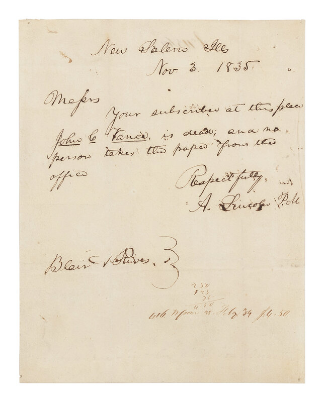 LINCOLN, Abraham (1809-1865). Autograph letter signed ("A. Lincoln P.M.") as Postmaster, to Blair & Rives. New Salem, Illinois, 3 November 1835.