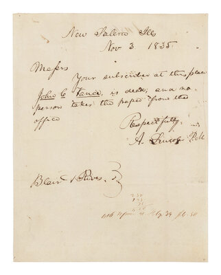 President Andrew Jackson appointed 24-year-old Abraham Lincoln postmaster of New Salem, Illinois on May 7, 1833, a position he held until the post office was closed on May 30, 1836. In this letter, Lincoln informs the publishers Francis P. Blair, Sr., and John C. Rives, that their subscriber, John C. Vance, is deceased and that no one is collecting his paper. The Papers of Abraham Lincoln Digital Library footnotes for this letter suggest that the "paper" referred to was likely The Globe, a popular Democratic political newspaper published in the District of Columbia, though Blair & Rives were also publishers of The Congressional Globe, which was less widely circulated. The footnotes also indicate that the notation below "Blair & Rives" is not in Lincoln’s hand, and it is unlikely that it is related to the content of the letter. Basler indicates that Vance was a local farmer living north of New Salem, whose copy of Kirkham's Grammar Lincoln purportedly utilized for his studies.