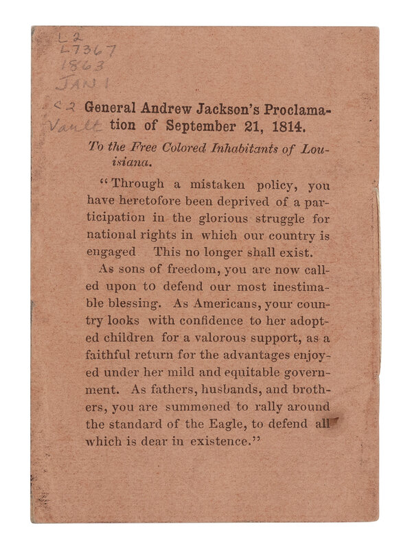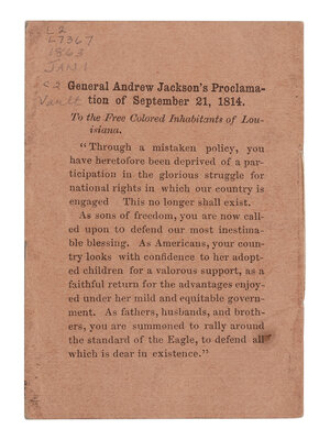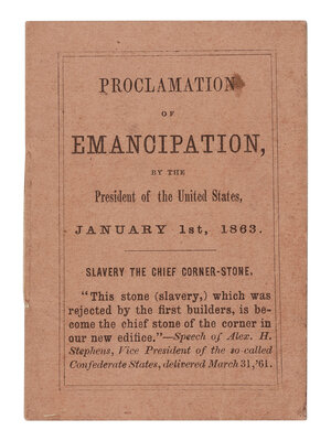 Lincoln's preliminary Emancipation Proclamation was dated 22 September 1862, while the revised, final document became official on 1 January 1863. This thin, miniature pamphlet contains the quotation by Alexander Stephens on the front wrapper that appeared on the back wrapper of the comparable miniature pamphlet edition of the preliminary proclamation (Eberstadt 7). It also differs in page count (8 pp. instead of 7 pp.), and contains a quote on the lower wrapper that reveals this printing's other purpose: to convince freed slaves to take up arms in the cause of the Union. The quote comes from Andrew Jackson's appeal to the free black population of New Orleans, as he prepared to defend the city from a British attack at the close of the War of 1812: "General Andrew Jackson's Proclamation of September 21, 1814. To the Free Colored Inhabitants of Louisiana. 'Through a mistaken policy, you have heretofore been deprived of a participation in the glorious struggle for national rights in which our country is engaged. This no longer shall exist. As sons of freedom, you are now called upon to defend our most inestimable blessing. As Americans, your country looks with confidence to her adopted children for a valorous support, as a faithful return for the advantages enjoyed under her mild and equitable government. As fathers, husbands, and brothers, you are summoned to rally around the standard of the Eagle, to defend all which is dear in existence.'"