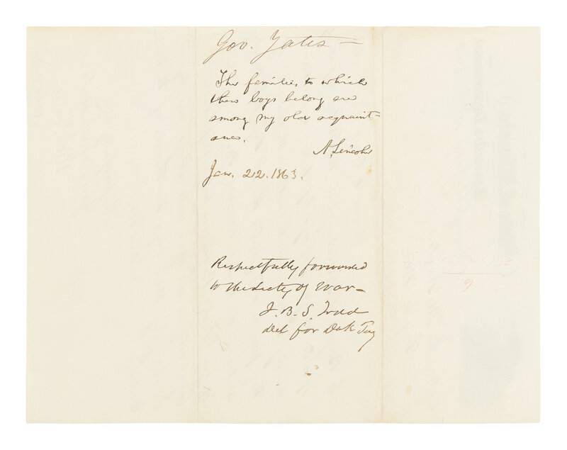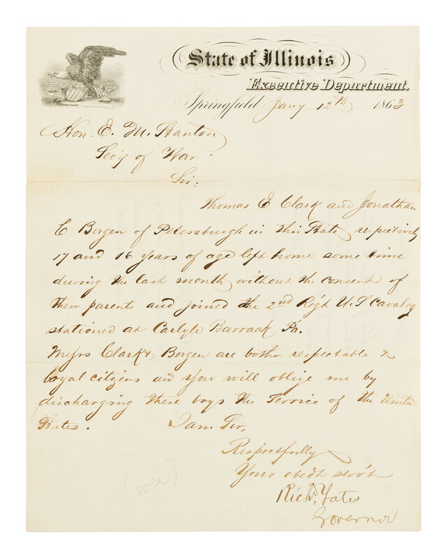 Yates's letter on recto (in a secretarial and signed by him) reads in full: "Thomas E Clark and Jonathan C Bergen of Petersburgh in this State respectively 17 and 16 years of age left home some time during the last month without the consent of their parents and joined the 2nd Reg’t U.S Cavalry stationed at Carlyle Barrack Pa. Messrs Clark & Bergen are both respectable & loyal citizens and you will oblige me by discharging these boys the service of the United States..." Basler, First Supplement p. 175.