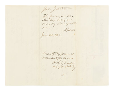 Endorsed by Lincoln on verso of a letter from Illinois Governor and Lincoln's friend and ally, Richard Yates (that letter, addressed to Edwin Stanton, and dated 12 January 1863). In full: "The families to which these boys belong are among my old acquaintances A. Lincoln Jan. 22, 1863."