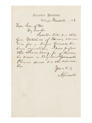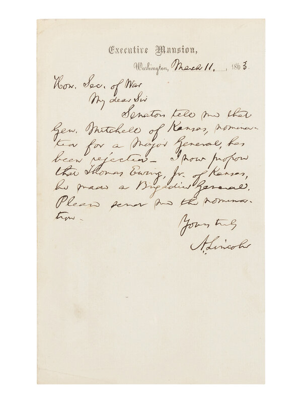 in full: "My dear Sir Senators tell me that Gen. Mitchell of Kansas, nominated for a Major General, has been rejected--I now propose that Thomas Ewing, Jr. of Kansas, be made a Brigadier General. Please send me the nomination. Yours truly A. Lincoln."