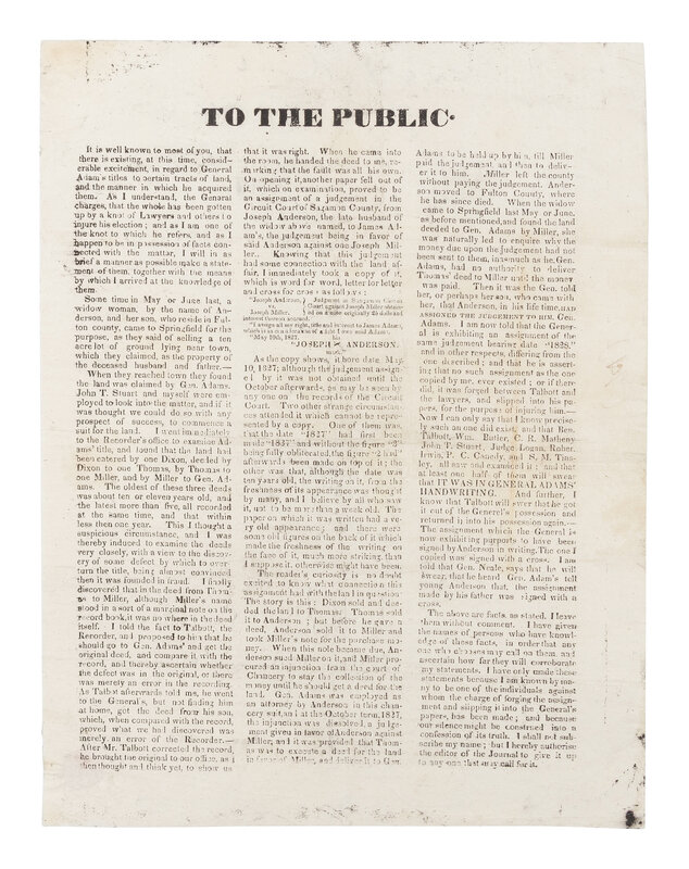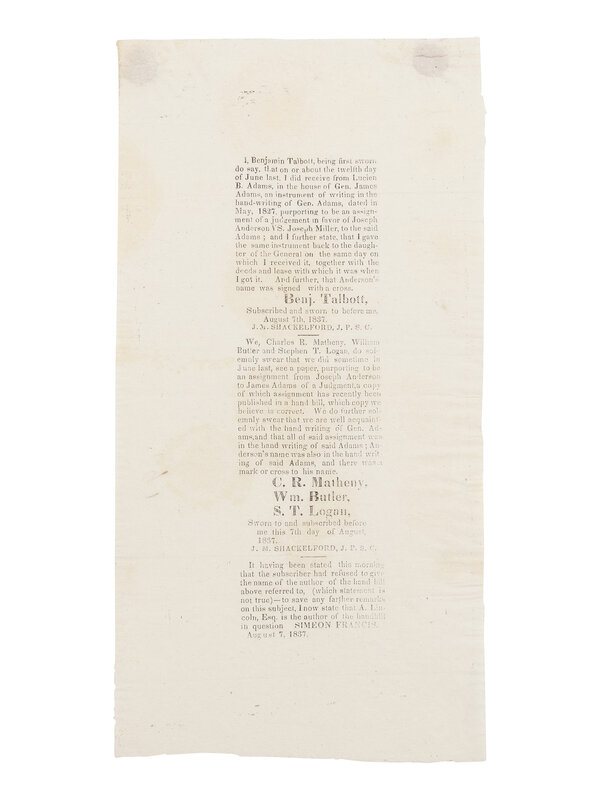 Equally rare. Printed a week later, this handbill gives the sworn testimony of the Recorder of Deeds Benjamin Talbott, and the testimony of C.R. Matheny, William Butler, and Stephen Logan (referencing the Adams handbill). Notably, it also prints a statement from Sangamo Journal publisher Simeon Francis announcing the authorship of the Adams Handbill as Abraham Lincoln ("I now state that A. Lincoln, Esq. is the author of the handbill in question..."). Bryd 346a; LPAL 139017.