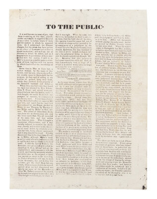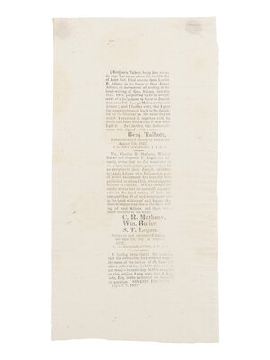 [With:] the accompanying printed handbill ("I, Benjamin Talbott..."), announcing Lincoln as the author of the above. (Springfield), 7 August 1837. Single sheet, printed in one column, 12 x 6 in. (305 x 152 mm). Old mounting residue in top corners verso.