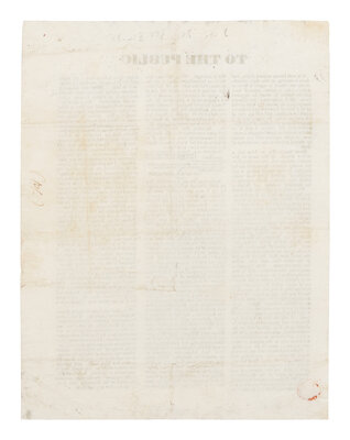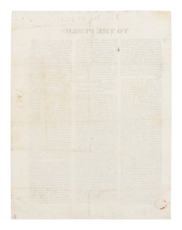EXCEEDINGLY RARE AND VIRTUALLY UNOBTAINABLE: "Characteristic of such items, it was printed on cheap paper with uneven sides. The inking was inconsistent, and the columns resembled a mountain range, ragged and zigzagging. It is not surprising that people did not deem it worth saving, accounting for ONLY ONE KNOWN EXTANT COPY" (Schwartz). Roy P. Basler, editor of The Collected Works of Abraham Lincoln, had to rely on a newspaper version because no copy of the actual handbill was known to exist. As a result, there are differences in punctuation and spelling between the original and the newspaper. Basler I, pp. 89-93 (newspaper printing); Bryd 335a (this copy: "The only known copy of the first separately printed piece of Lincolniana."); Law Practice of Abraham Lincoln (LPAL) 120622; Schwartz, The Lincoln Handbill of 1837: A Rare Document's History (Journal of the Illinois State Historical Society, Vol. 29, No. 2, Jul., 1936, pp. 135-150).