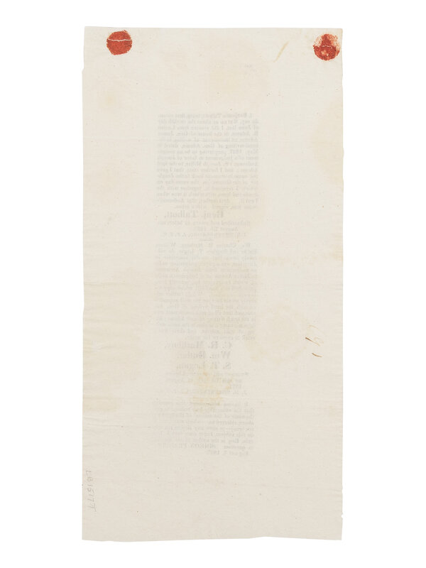 Handbill, printed in three columns, 12 x 9 1/8 in. (305 x 232 mm). Docketed on verso, presumably by Lincoln ("A.L."). Light soiling to recto, remnants of red wax seal in bottom right corner verso; in blue morocco case.