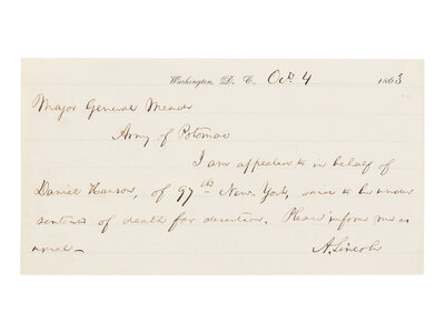 In full: "Major General Meade Army of Potomac I am appealed to in behalf of Daniel Hanson, of 97th New-York, said to be under sentence of death for desertion. Please inform me as usual--A. Lincoln".