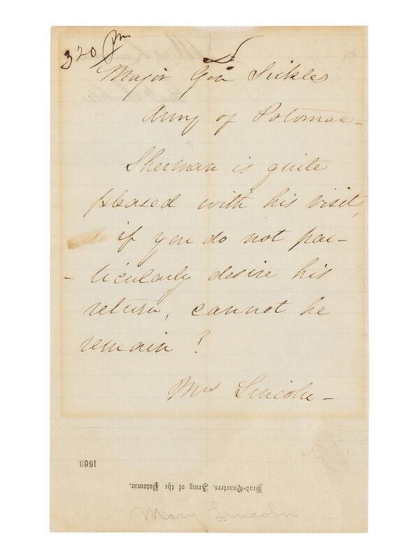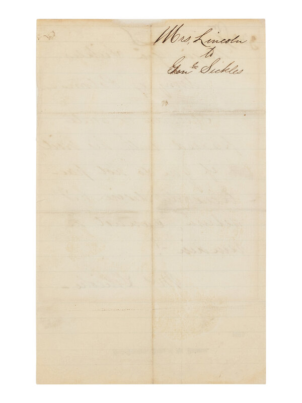 LINCOLN, Mary Todd (1818-1882). Autograph letter signed ("Mrs. Lincoln") to Major General Daniel Sickles. Washington, D.C., undated [ca. 1863].