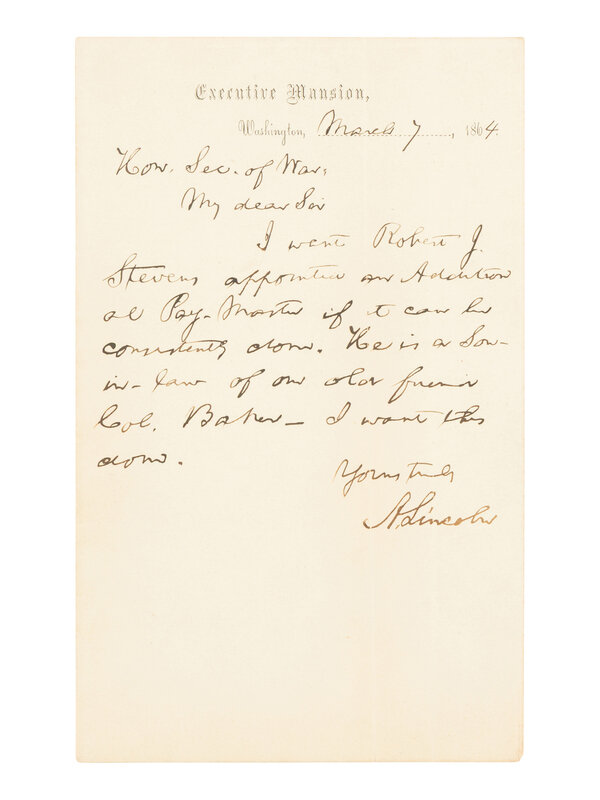 Reads in full: "Hon. Sec. of War: My dear Sir I want Robert J. Stevens appointed an Additional Pay-Master if it can be consistently done. He is a Son-in-law of an old friend Col. Baker--I want this done. Yours truly A. Lincoln".