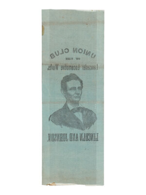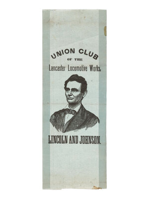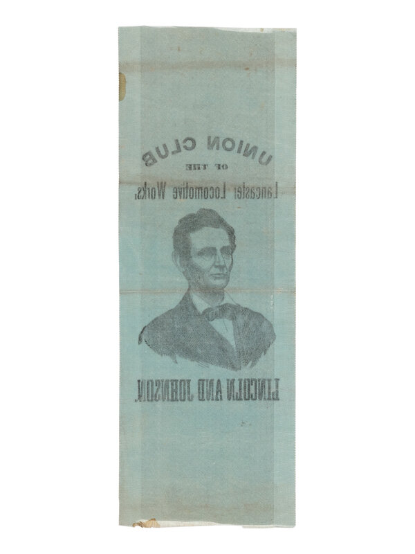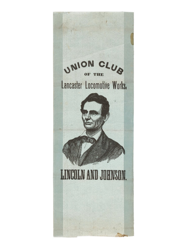 Blue silk campaign ribbon, featuring a portrait of Lincoln at center, with "Union Club / of the / Lancaster Locomotive Works." above, and "Lincoln and Johnson." below. Top edge lightly frayed; horizontal creasing; soiling to upper right edge and right side of bottom edge. 7 x 2 1/2 in. (177 x 63.5 mm).