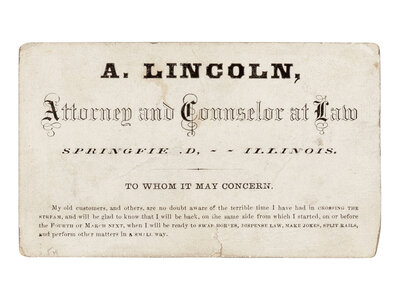 Faux-business card printed during the 1864 presidential election, presumably by the Democratic National Committee of Springfield, advertising Lincoln's services as a lawyer beginning on 4 March 1865.