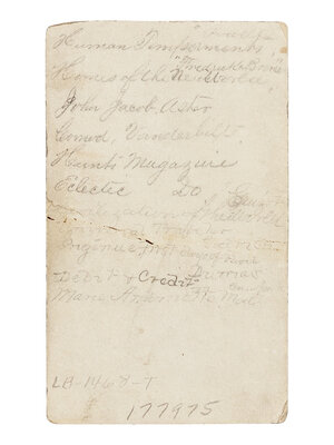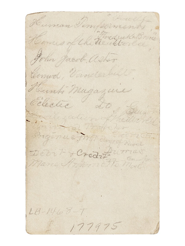 Single oblong card; 2 x 3 3/4 in. (51 x 95 mm); rubbing and wear along edges; penciled notations on verso.