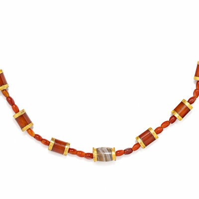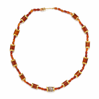 An Egyptian Carnelian, Gold, and Banded Agate Bead Necklace