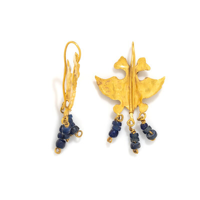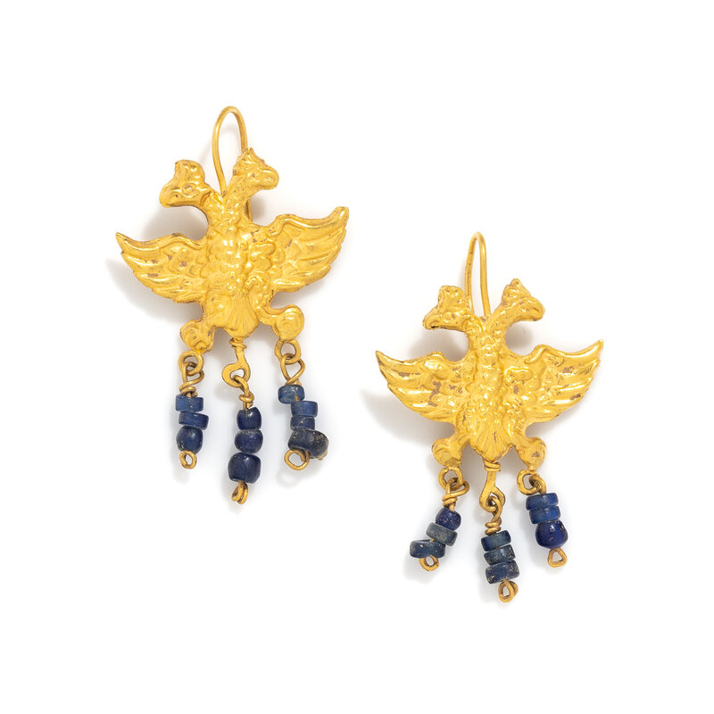 A Pair of Eastern European Gold and Blue Glass Earrings with Double-Headed Eagles