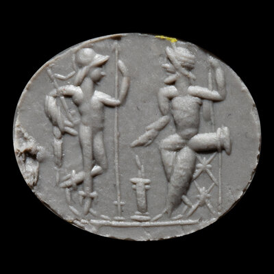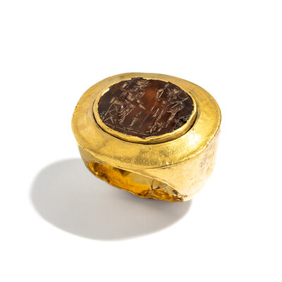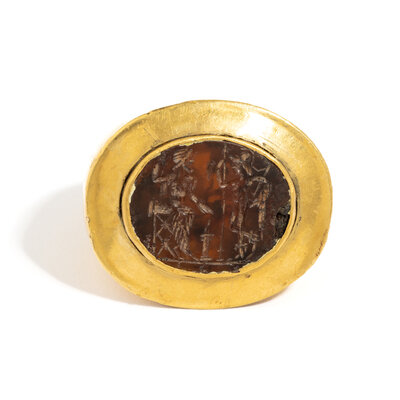 An Eastern Roman Gold and Carnelian Finger Ring with the Gods Jupiter and Mars