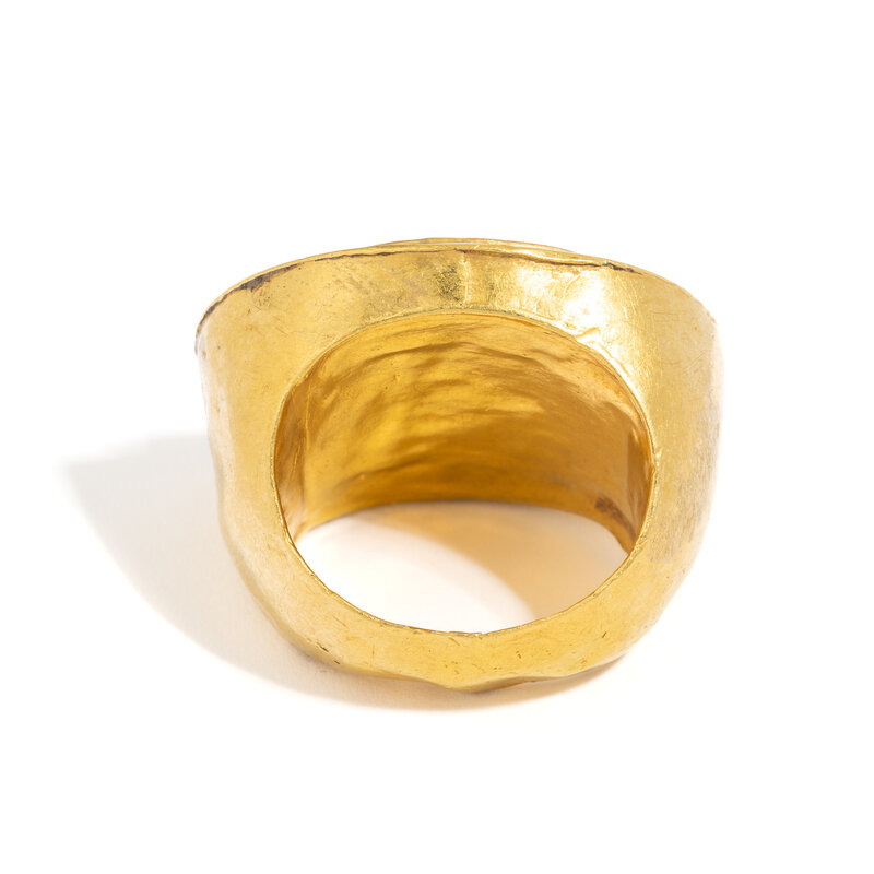 Width 2.9 cm (1 1/8 inches); Ring size 4 3/4; High karat gold; 19.73 grams.