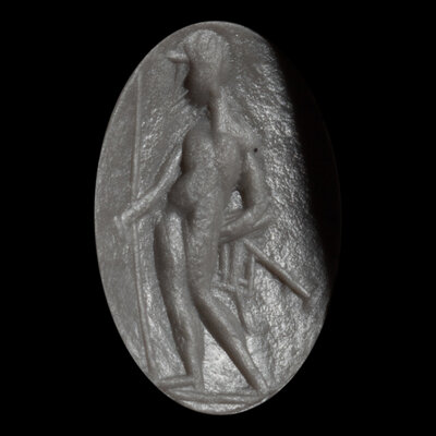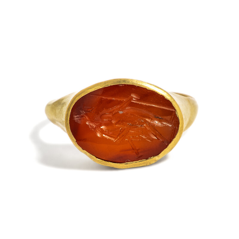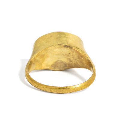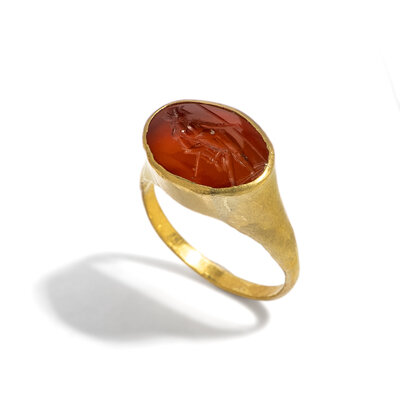 A Roman Gold and Carnelian Finger Ring with a Male Standing Figure