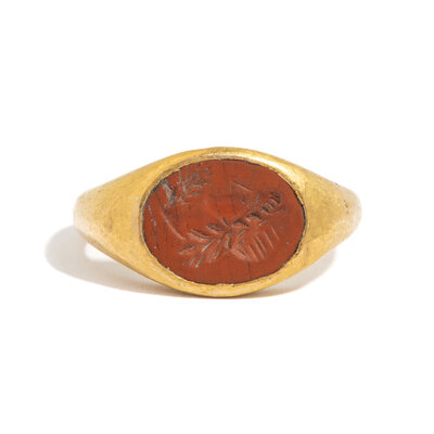 A Roman Gold and Red Jasper Finger Ring with a Male God
