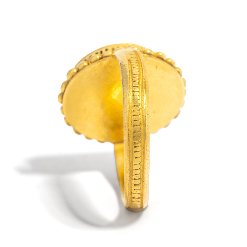 Height 2.5 cm (1 inch); Ring size 8; High karat gold; 9.33 grams.