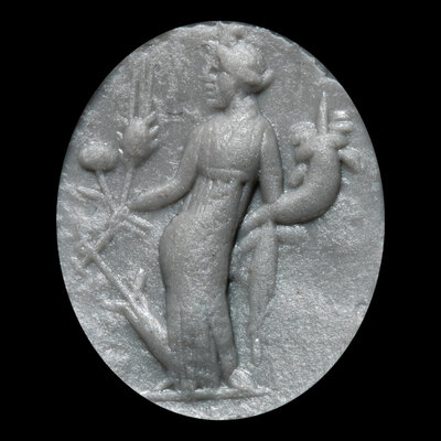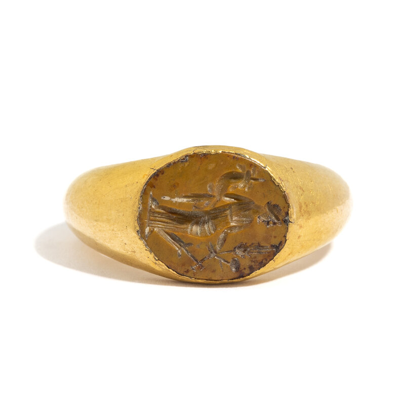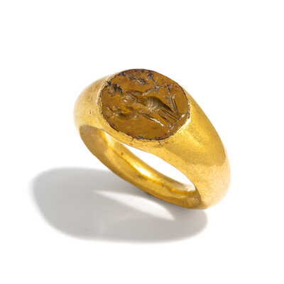 A Roman Gold and Yellow Jasper Finger Ring with the Goddess Fortuna-Tyche