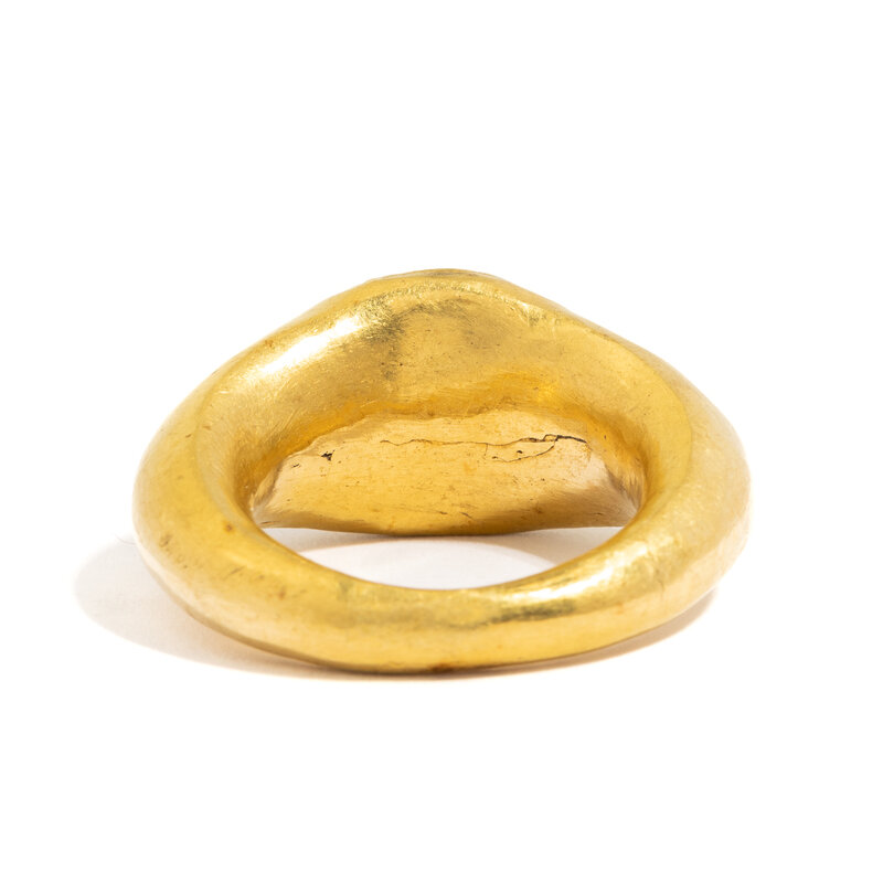 Width 2.6 cm (1 inch); Ring size 4 3/4; High karat gold; 4.79 grams.