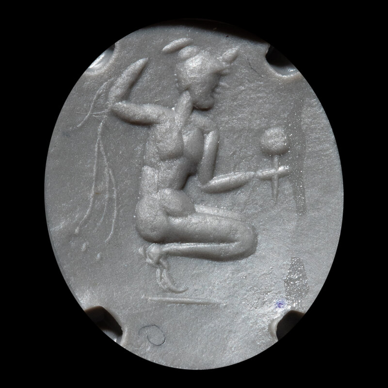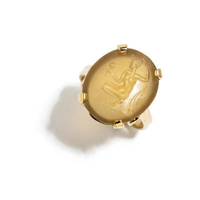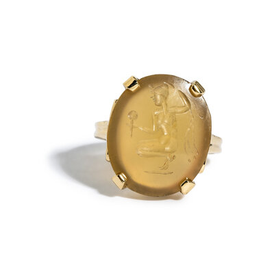 A Roman Chalcedony Ring Stone with a Crouching Figure