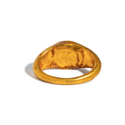 Width 2.3 cm (7/8 inch); Ring size 5 3/4; High karat gold; 3.84 grams.