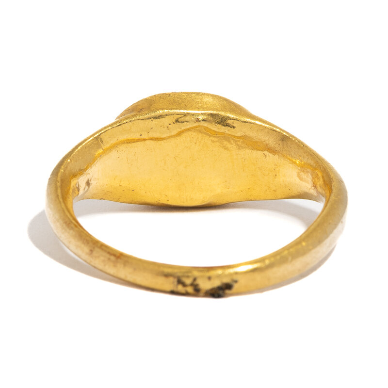 Width 1.9 cm (3/4 inch); Ring size 3 1/2; High karat gold; 3.4 grams.