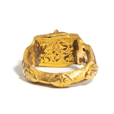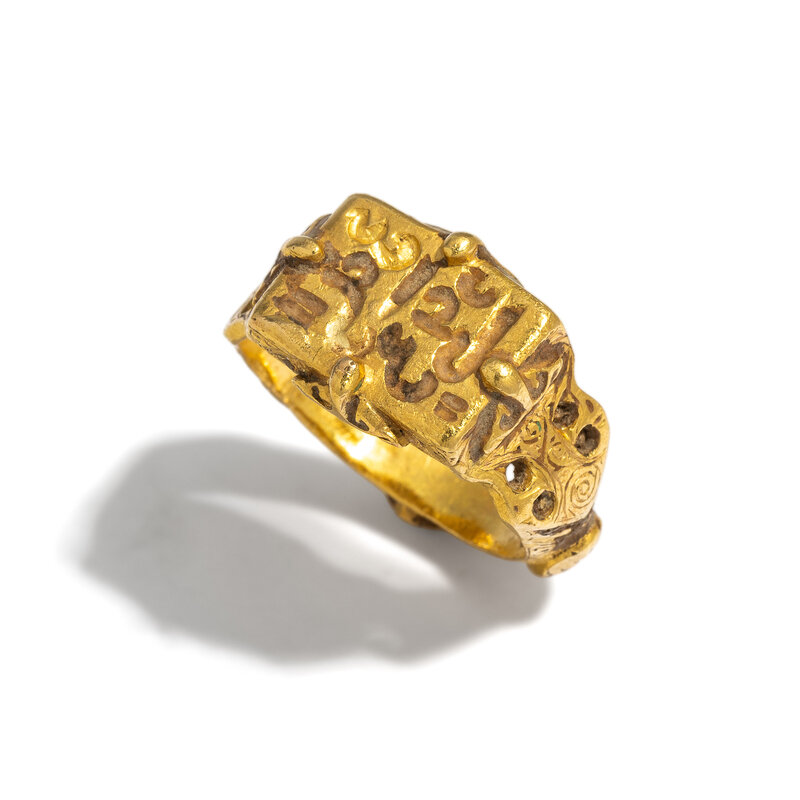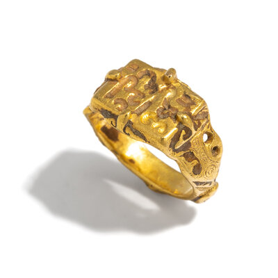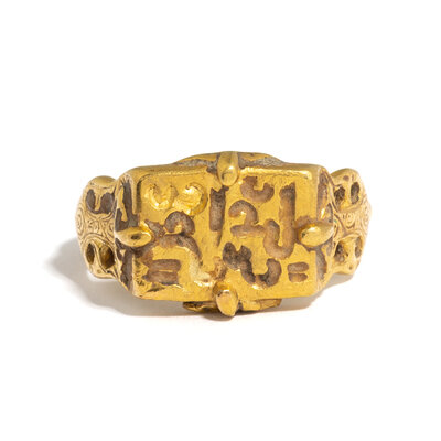 Width 2 cm (3/4 inch); Ring size 4 3/4; High karat gold; 10.06 grams.