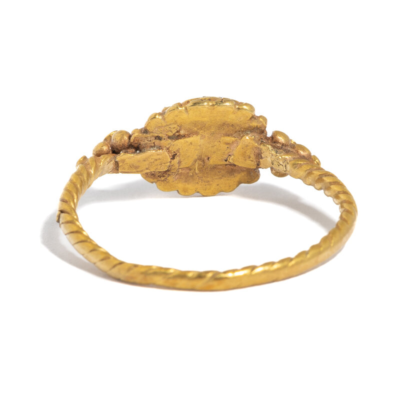 Height 2.2 cm (7/8 inch); Ring size 6 3/4; High karat gold; 2.42 grams.