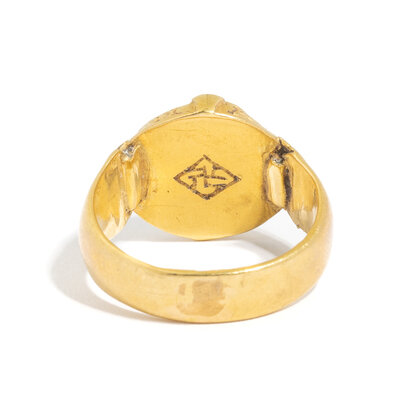 Height 2 cm (3/4 inch); Ring size 5 1/2; High karat gold; 6.39 grams.
