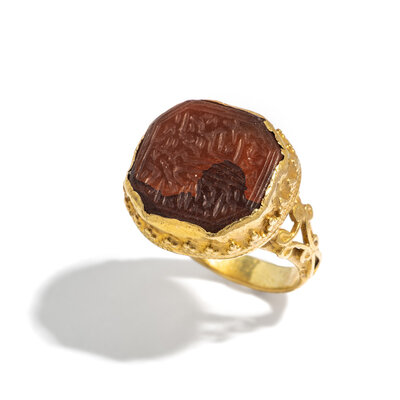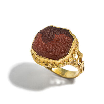 Height 2.4 cm (1 inch); Ring size 6 3/4; 18 karat gold; 7.35 grams.