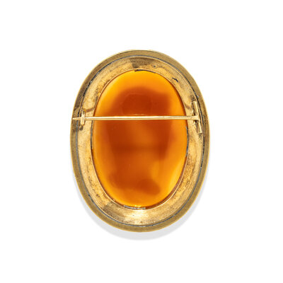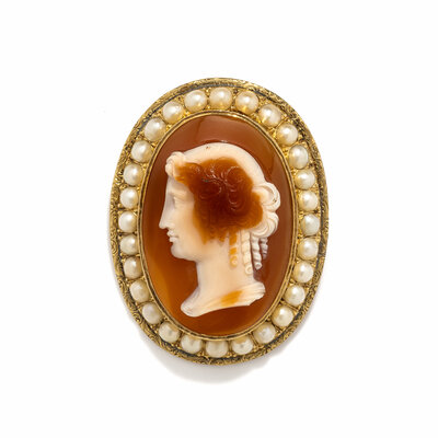 A Neoclassical Gold, Pearl, and Sardonyx Cameo Brooch