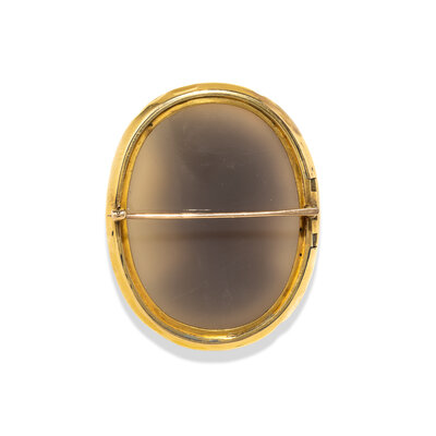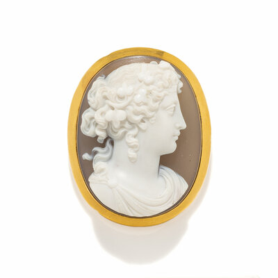 A Neoclassical Gold and Sardonyx Cameo Brooch with the Portrait Head of a Goddess