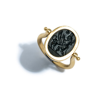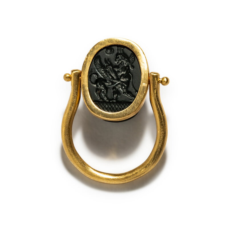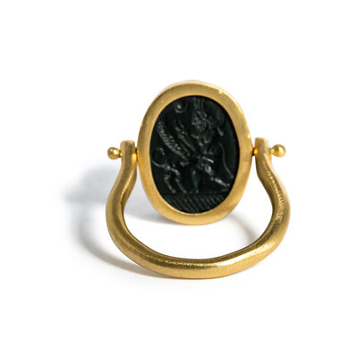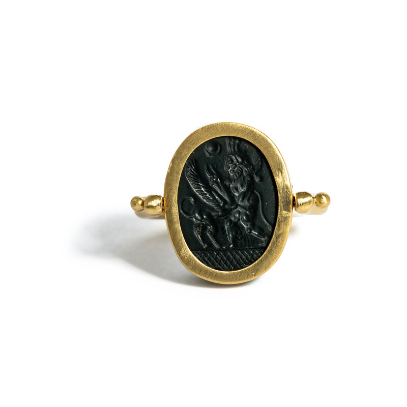 Height of ring 3.4 cm (1 3/8 inches); Ring size 11; 18 karat gold; 12.24 grams.