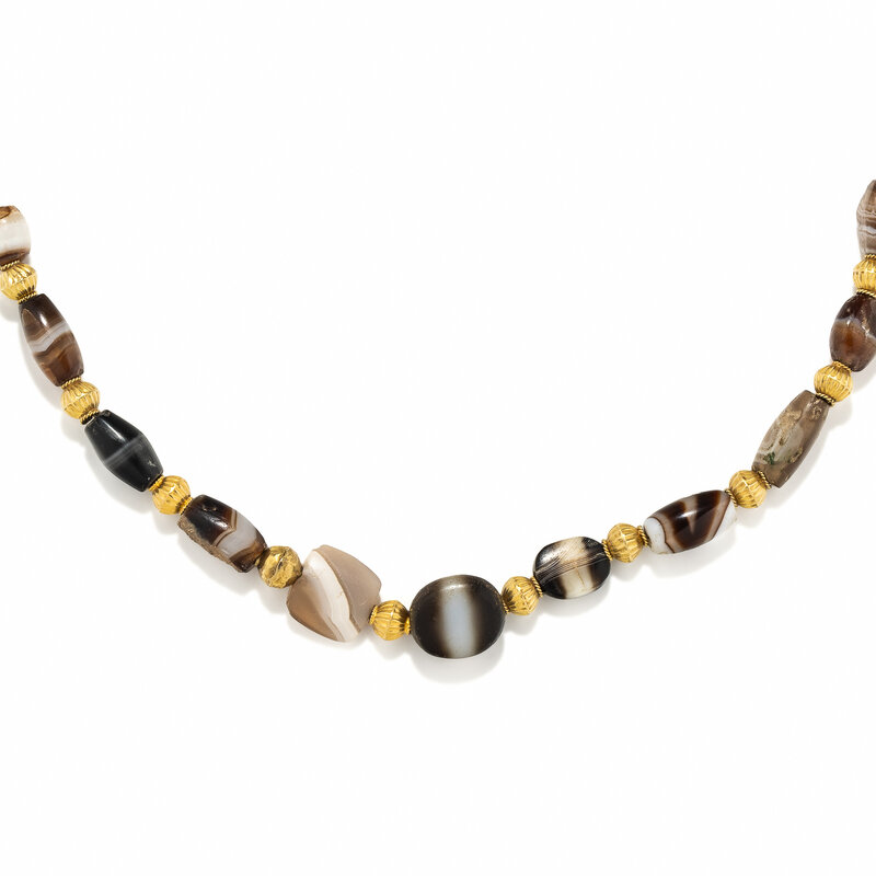 A Near Eastern Gold and Banded Agate Bead Necklace