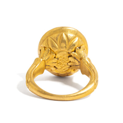 Height 3 cm (1 1/8 inches); Ring size 7 1/2; High karat gold; 12 grams.