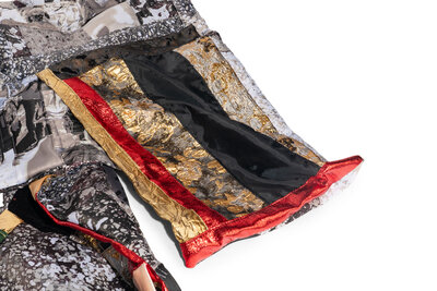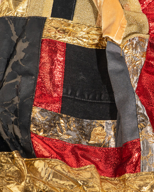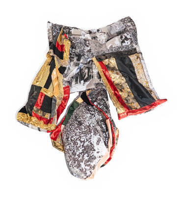 synthetic weavings of photographs taken by artist, silk, crushed velvet, metallics and brocade