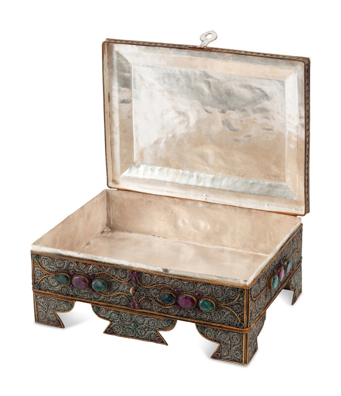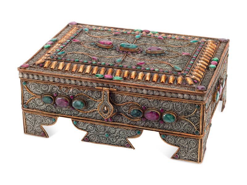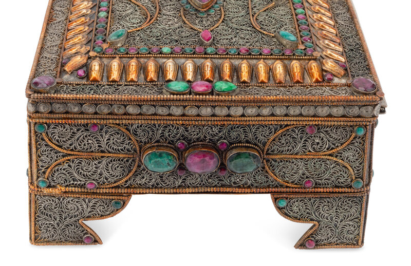 A Silvered Metal Filigree, Ruby and Emerald Table Casket